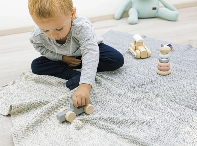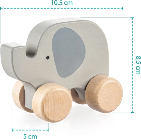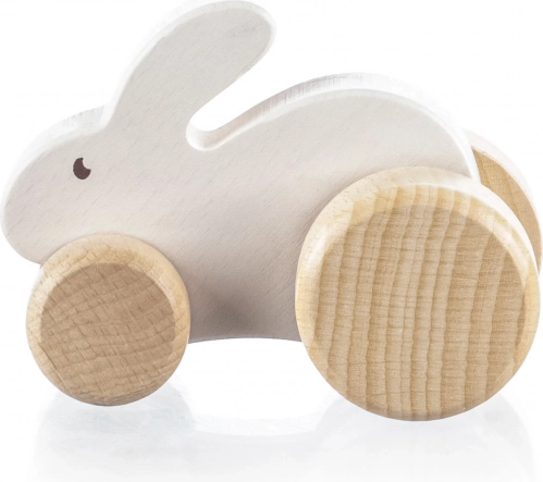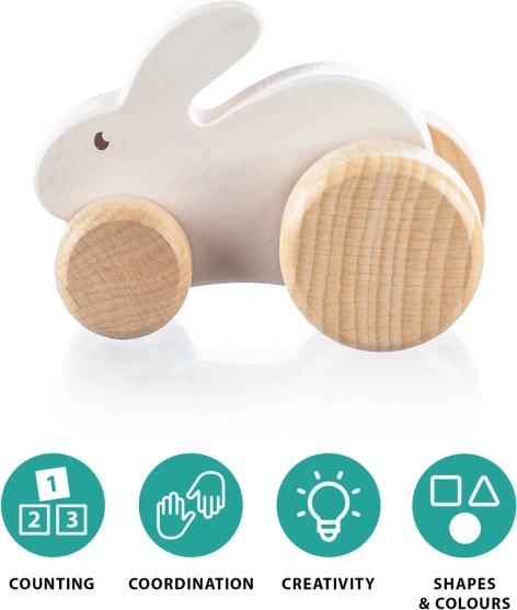 Drveni zečić na kotačima osmišljen je tako da savršeno pristaje u male dječje ruke. Izrađen je od kvalitetnog prirodnog drva i obojan bojama na bazi vode koje su sigurne za djecu. Zahvaljujući izdržljivim kotačima, lako svladava vožnju po tepihu, drvenom podu ili čak na igralištu.