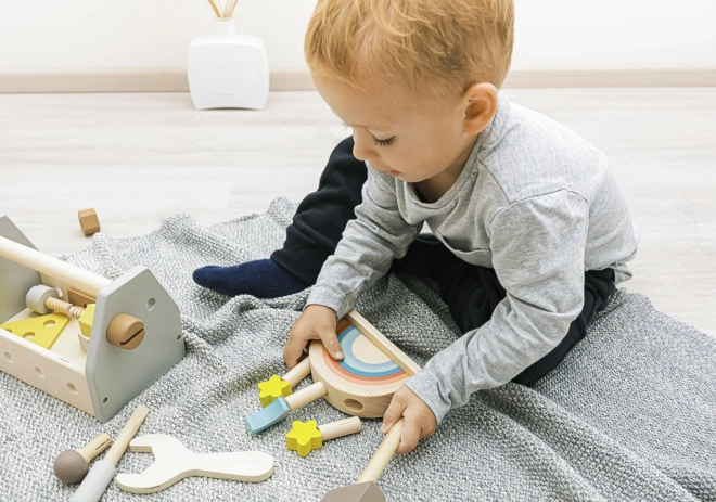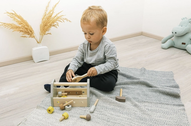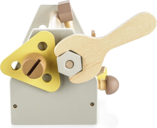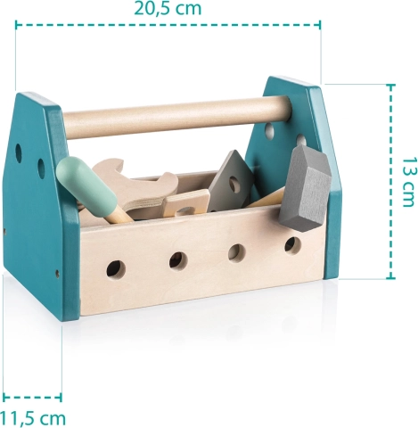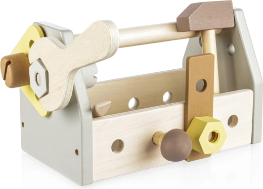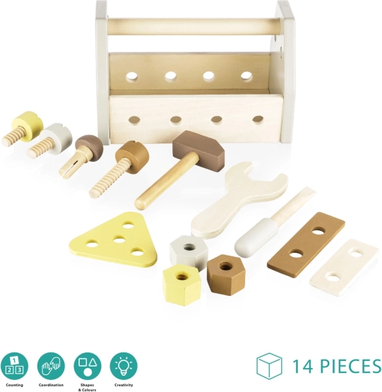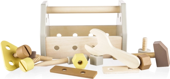 Ovaj bezvremenski drveni set alata u robusnoj kutiji djeci nudi siguran ulazak u svijet uradi-sam vještina. Zahvaljujući realističnim alatima poput čekića, odvijača i ključa, djeca vježbaju hvat, koordinaciju i strpljenje, dok na zabavan način otkrivaju principe zatezanja i spajanja.
