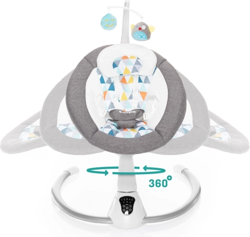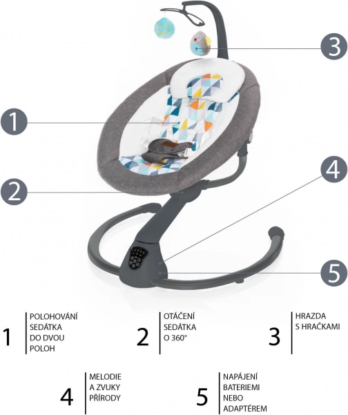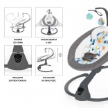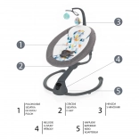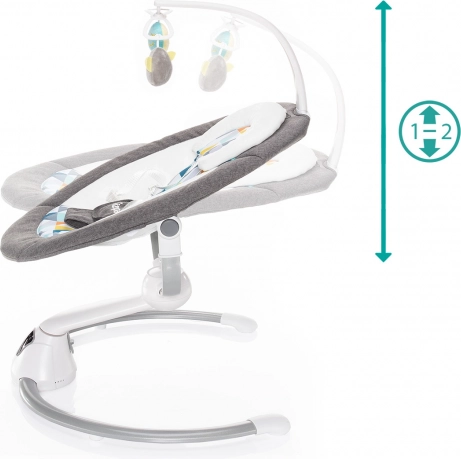 Intuitivna dodirna ploča i priloženi daljinski upravljač omogućuju udobno postavljanje intenziteta ljuljanja (5 razina), trajanja ljuljanja (8/15/30 min) i glasnoće melodija. Automatsko pokretanje ljuljanja pri detekciji pokreta djeteta osigurava mir i u zahtjevnijim trenucima. Bogata podstava, sigurnosni pojas u 5 točaka i garten s dvjema odvojivim plišanim igračkama pobrinut će se za sigurnost i radost.
