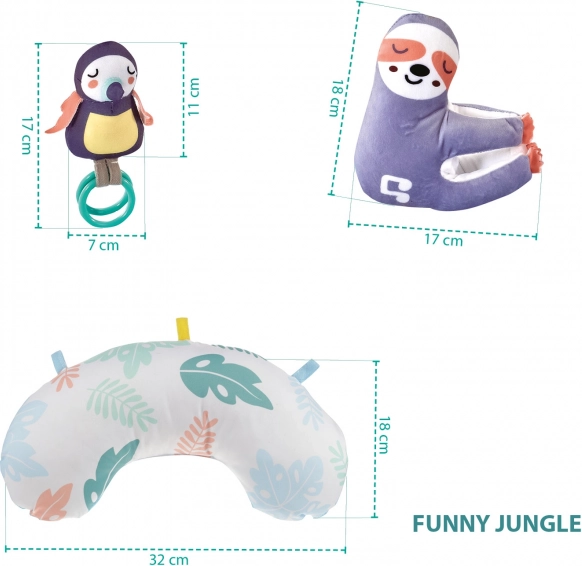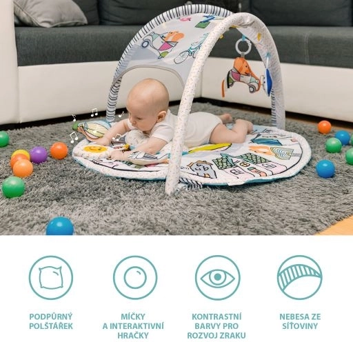 Dio pakiranja je oblikovani potporni jastučić s petljama za pričvršćivanje igračaka. Idealan je za vježbanje vremena na trbuščiću, a kasnije i puzanja – pruža stabilnu potporu i potiče pravilno držanje tijela. Nježni, antialergijski materijali s izraženim kontrastnim bojama razvijaju vid i znatiželju najmlađih. Za još više mogućnosti igre tu je 20 šarenih loptica.