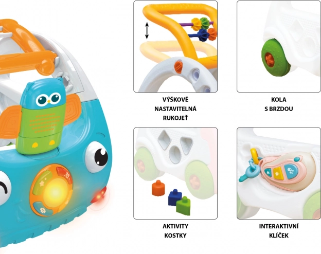 Aktivnosti guralica 3u1 idealan je pomagač za učenje hodanja i istodobno interaktivna igračka koja će djecu zabaviti na dugi niz sati. Dječja guralica u obliku autića nudi raznolike funkcije za razvoj motorike, koordinacije i kreativnosti – od aktivnosti kockica preko slagalice do brojalice. Interaktivni ključ s tipkama aktivira svjetlosne i zvučne efekte koji motiviraju na igru i kretanje.