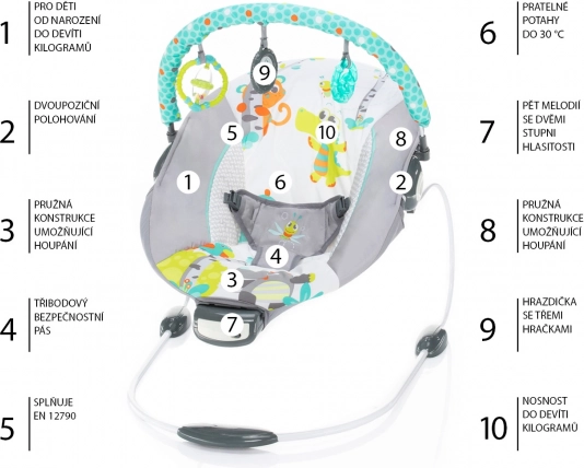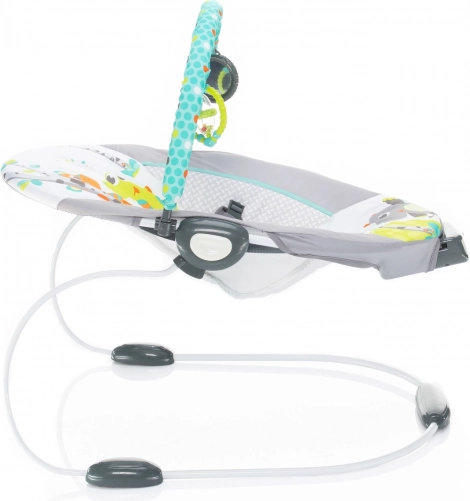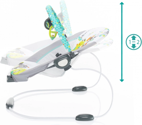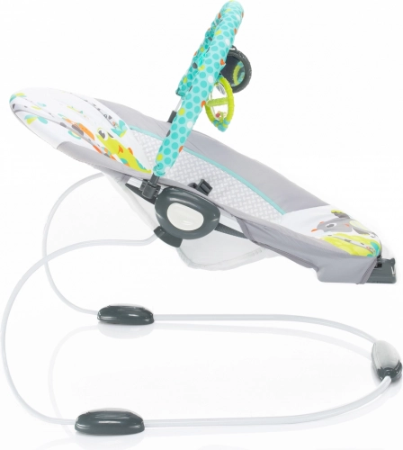 Ležaljka Happy ponudit će vašem mališanu mnogo novih podražaja, zato će je sigurno zavoljeti. Njezin nosivi element je elastična konstrukcija koju beba svojim pokretima može sama “zaljuljati”. U međuvremenu će 3-točkasti sigurnosni pojas i protuklizne nožice osigurati njezinu sigurnost. Pažnju djeteta u ležaljci privlači i lijepa prečka s 3 perive igračke koje razvijaju dječja osjetila i finu motoriku. 2-stupanjsko podešavanje položaja pružit će vašem mališanu ugodno sjedenje i najbolji pogled.