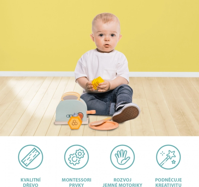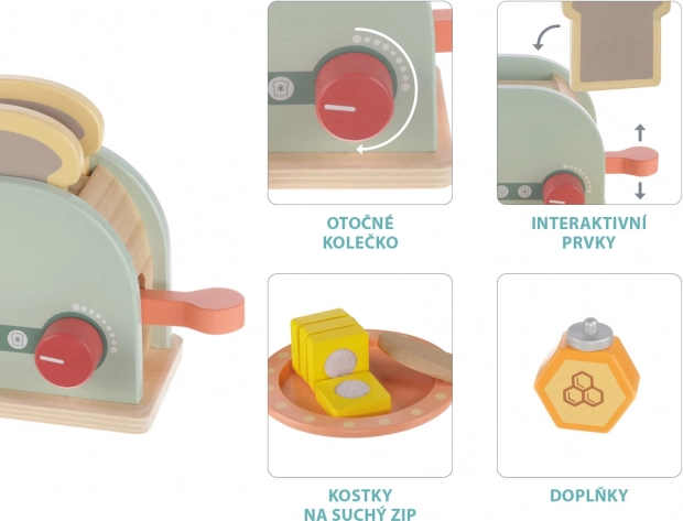 Priprema hrane je zabavna – čak i one drvene. Set sadrži toster s kriškom tosta. Nakon pritiska na polugu, tost iskoči iz tostera. U kompletu su i tanjurić s nožićem i maslacem kako bi doručak bio potpun. Igračka razvija koordinaciju, prostornu maštu i spretnost ruku. Toster je izrađen od kvalitetnog drva i boja na bazi vode.