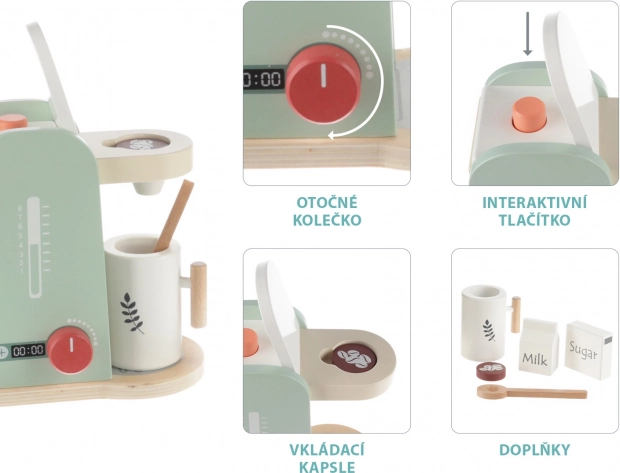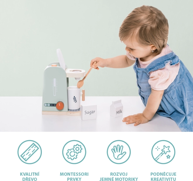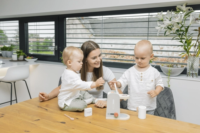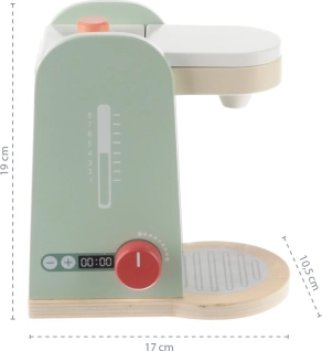 Razrađeni drveni aparat za kavu izravno poziva na pripremu dobre kave. Aparat ima nekoliko gumba koje se može okretati ili pritiskati. U kompletu je velika drvena šalica s žličicom i sastojci za pripremu kave. Igračka je izrađena od kvalitetnog drva i boja na bazi vode.