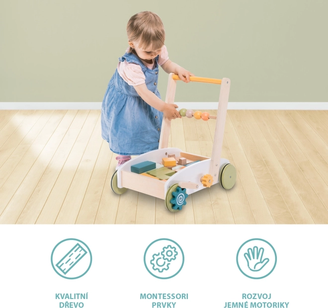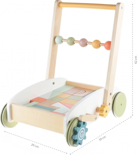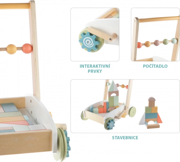 Mašti nema granica. Kompaktni vagončić s drvenom ručkom pun je raznobojnih kocaka od kojih dijete može izgraditi što god poželi. Ako se kocke izvade iz vagončića, može se koristiti za prijevoz drugih igračaka. Ručka je opremljena drvenim kuglicama koje se mogu pomicati s jedne strane na drugu. Izdržljivi kotačići prilagođavaju se svakoj vrsti poda. Igračka razvija koordinaciju, motoriku, prostornu predodžbu i maštu.