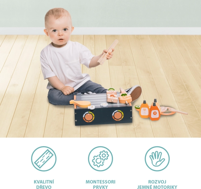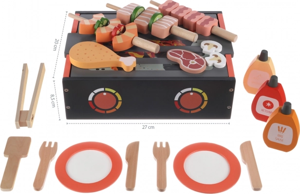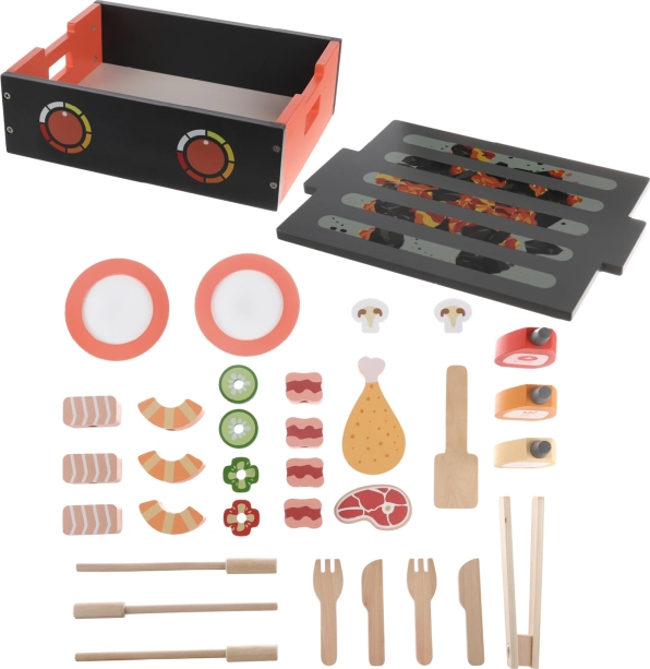 Drveni roštilj ujedno služi kao spremnik za sve sastojke koje dijete želi ispeći. Dovoljno je pomaknuti gornju roštiljnu ploču, a ispod se nalaze drveno meso, povrće, umaci, prilozi, ali i tanjur, pribor za jelo i alati za roštiljanje. Igračka je izrađena od izdržljivog bukovog drva, a sve korištene boje su zdravstveno neškodljive i na bazi vode.