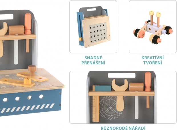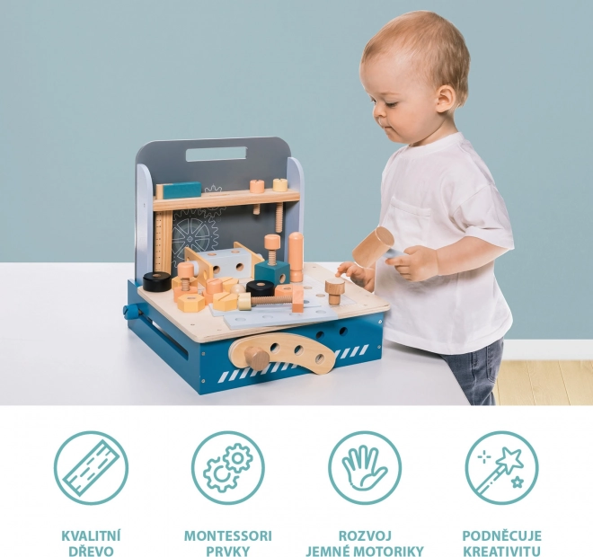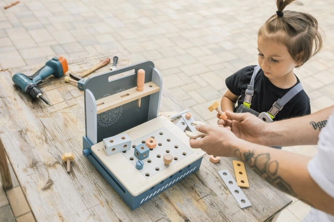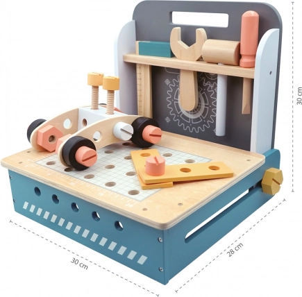 Kompaktni sklopivi radni stol ima velik broj drvenih komponenti, od drvenih pločica s rupama do vijaka i matica. Zahvaljujući bezbrojnim mogućnostima slaganja potiče dječji um i podržava kreativno razmišljanje. Također razvija finu motoriku i osnovnu koordinaciju ruku. Sklopivi radni stol izrađen je od kvalitetnog drva i boja na bazi vode.