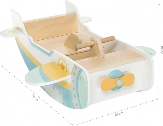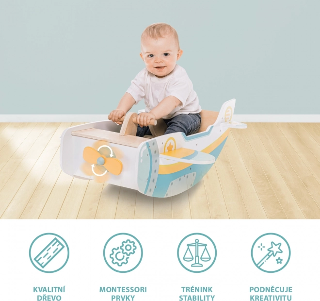 Avion spreman za polijetanje koji će djeci pružiti sate zabave. Sigurno ljuljanje osigurano je s dvije ručke u prednjem dijelu. Široko sjedalo ima naslon za leđa, ako se dijete želi samo nježno ljuljati vlastitom težinom. Ljuljačka avion izrađena je od kvalitetnog, izdržljivog bukovog drva. Sve korištene boje su zdravstveno ispravne i na bazi vode.
