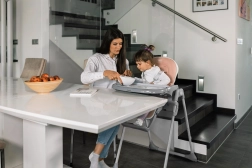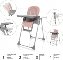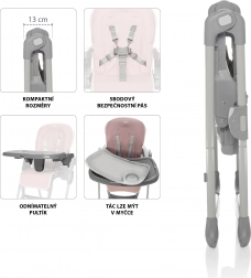 Odvojivi pladanj s izvadivom tacnom može se prati u perilici posuđa, perivu presvlaku dovoljno je obrisati. Pojas u 5 točaka drži dijete sigurno.