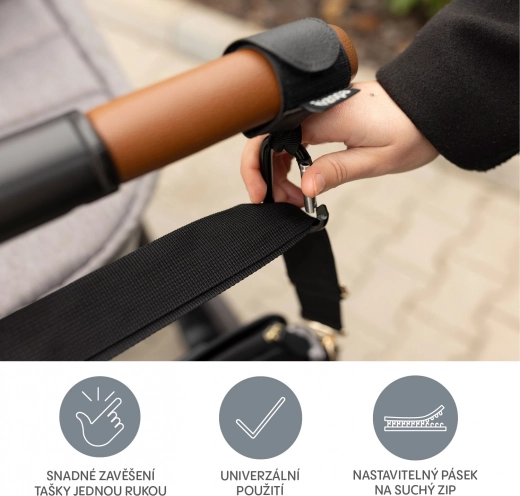 Uživajte u ugodnim i organiziranim šetnjama s kolicima. Multifunkcionalne trake s kukom proširuju prostor za odlaganje i omogućuju sigurno i pregledno pričvršćivanje torbice, torbe za presvlačenje ili vrećica s kupnjom. Univerzalno pričvršćivanje s čičkom odgovara većini rukohvata, uključujući i one s kožnim premazom.