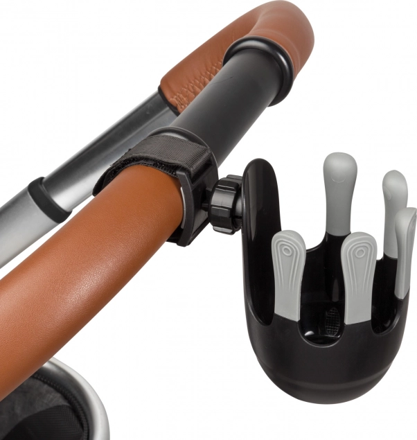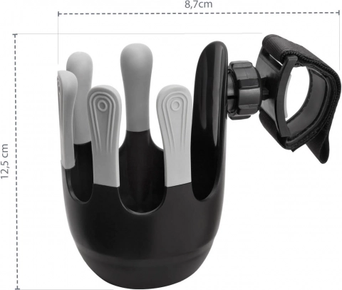 Fleksibilni držač za napitke dizajniran je tako da u njega stanu dječje bočice, šalice za kavu i veće boce s vodom promjera do 8,5 cm. Sustav s rotacijom od 360° može se zahvaljujući jednostavnoj instalaciji pomoću čička pričvrstiti na ručku gotovo svakih kolica. Jedinstveni, modernog izgleda, petoprsti sustav osigurava bolju stabilnost šalice ili boce te sprječava neželjeno prolijevanje napitka.