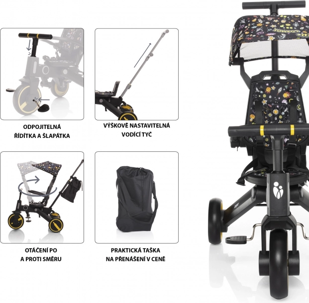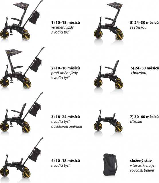 Trokolica je udobnija alternativa kolicima i ujedno prijelazni korak prema guralicama i biciklima. Zahvaljujući visinski podesivoj vodilici i mogućnosti isključivanja upravljača u potpunosti može zamijeniti kolica, a dijete će se pritom više zabaviti. Odvojive pedale mogu se koristiti kao pedale kada dijete samo upravlja trokolicom ili, za manju djecu, kao oslonac za noge. Za udobniju vožnju brinu sjedalo i naslon, koji su opremljeni podstavom, a ona je uklonjiva radi lakšeg čišćenja.