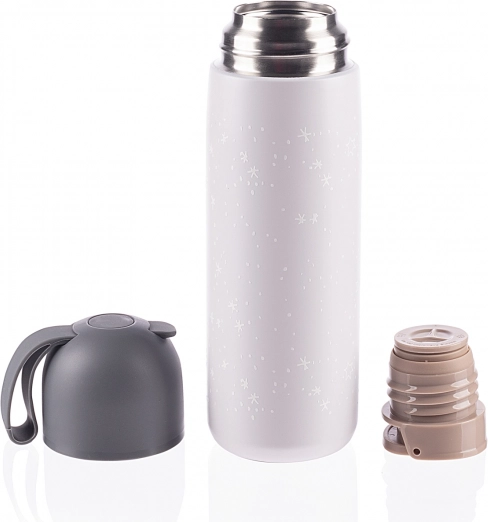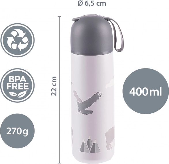 Kvalitetna termosica za tekućine zapremine 400 ml čuva tople napitke do 12 sati, a hladne do 24 sata. Izrađena je od visokokvalitetnog nehrđajućeg čelika otpornog na koroziju. Hermetičan poklopac sprječava curenje, a gornji izljev za praktično točenje osigurava da se ne polijete ni tijekom vožnje neravnim putem; također možete biti sigurni da se dijete neće opeći tekućinom iz termosice zahvaljujući dvostrukom zatvaraču. Poklopac termosice može se koristiti kao šalica.