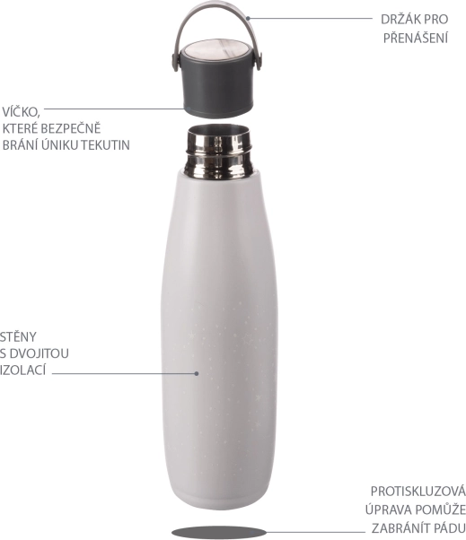 Kvalitetna termosica za tekućine zapremnine 480 ml čuva tople napitke do 12 sati, a hladne do 24 sata. Izrađena je od kvalitetnog nehrđajućeg čelika otpornog na koroziju. Nepropusni poklopac sprječava curenje. Zahvaljujući vakuumskoj izolaciji, termosica se pri punjenju vrućom tekućinom ne zagrijava izvana. Za udobno držanje termosica je opremljena držačem.