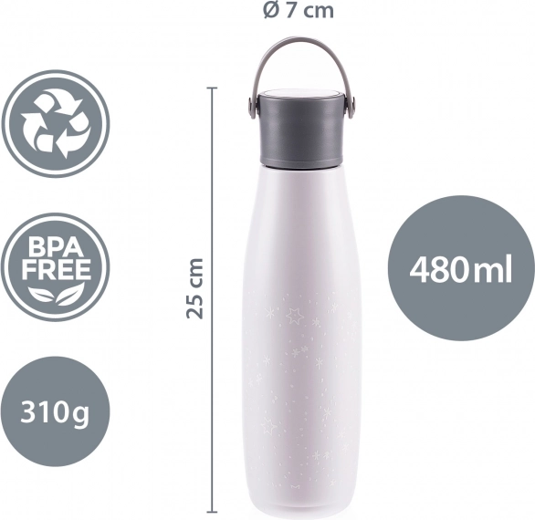 Kvalitetna termosica za tekućine zapremnine 480 ml čuva tople napitke do 12 sati, a hladne do 24 sata. Izrađena je od kvalitetnog nehrđajućeg čelika koji je otporan na koroziju. Čvrst poklopac osigurava da termosica ne propušta. Zahvaljujući vakuumskoj izolaciji, termosica se pri punjenju vrućom tekućinom ne zagrijava izvana. Za udobno držanje opremljena je držačem.