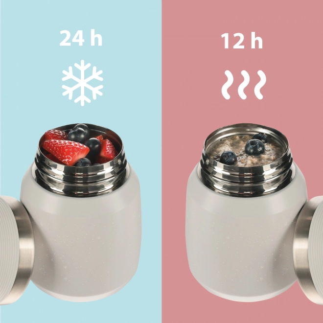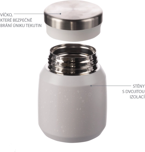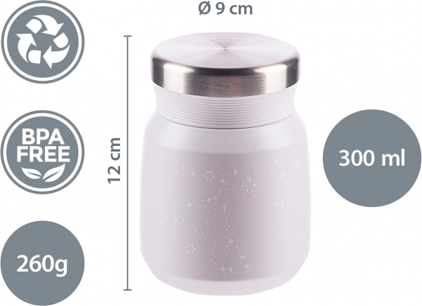 Kvalitetna termosica za hranu i kašice zapremnine 300 ml čuva topla jela do 12 sati, a hladna do 24 sata. Izrađena je od kvalitetnog nehrđajućeg čelika otpornog na koroziju. Čvrst poklopac osigurava da termosica ne propušta. Zahvaljujući vakuumskoj izolaciji, termosica se pri punjenju vrućim sadržajem ne zagrijava izvana.