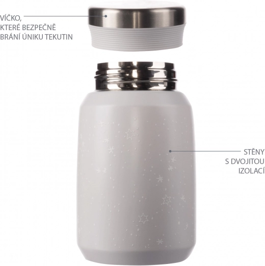 Kvalitetna termos posuda za hranu i kašice zapremnine 500 ml održava topla jela do 12 sati, a hladna do 24 sata. Izrađena je od kvalitetnog nehrđajućeg čelika otpornog na koroziju. Nepropusni poklopac osigurava da termos ne curi. Zahvaljujući vakuumskoj izolaciji, termos se pri punjenju vrućim sadržajem ne zagrijava izvana.