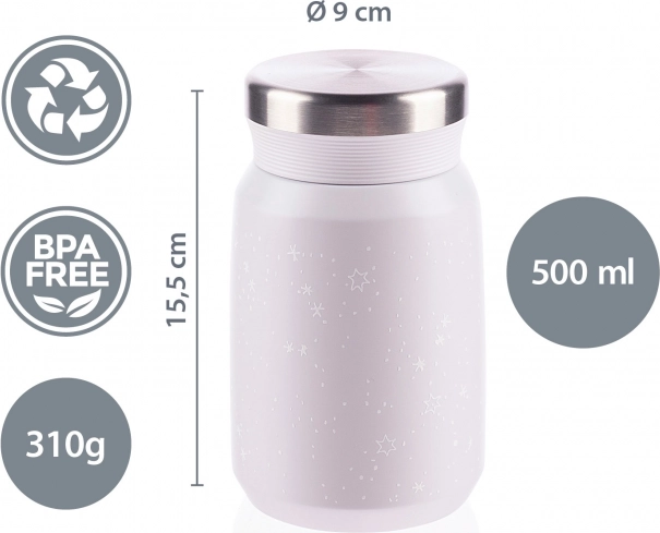 Kvalitetna termosica za hranu i kašice zapremnine 500 ml čuva topla jela do 12 sati, a hladna do 24 sata. Izrađena je od visokokvalitetnog nehrđajućeg čelika otpornog na koroziju. Hermetičan poklopac osigurava da termosica ne propušta. Zahvaljujući vakuumskoj izolaciji, termosica se pri punjenju vrućim sadržajem ne zagrijava izvana.