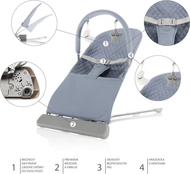 Savršeni odmor vašoj bebi osigurat će ugodne vibracije, 2 položaja naslona za leđa, udobno podstavljanje, koje je uz to u modernom dizajnu koji se uklapa u svaki dom. Vrijeme provedeno u ležaljci može biti ne samo odmor, već i zabava zahvaljujući prečki za igračke, koja potiče osjetila bebe.