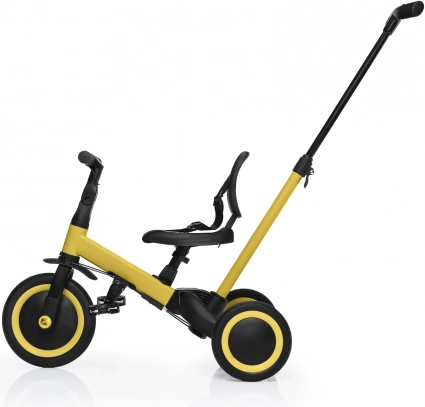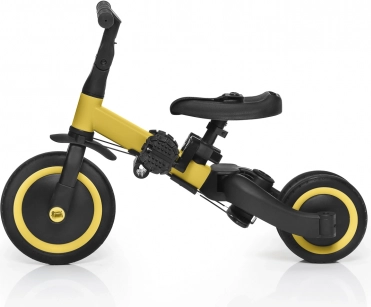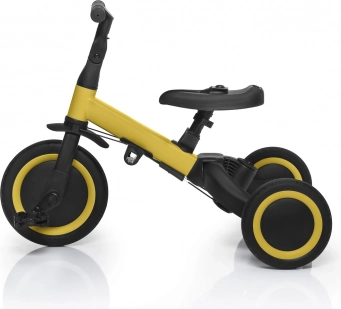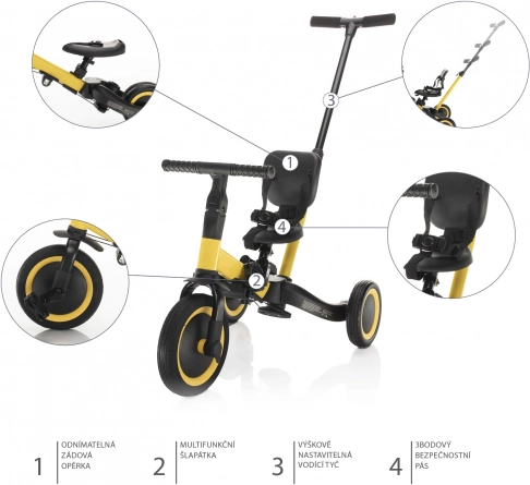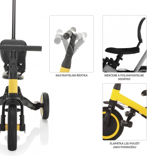 Jedno vozilo pokriva tri razvojne faze: 18–36 mjeseci trokolica (s/bez vodilice), 36–48 mjeseci guralica i 48–60 mjeseci bicikl.