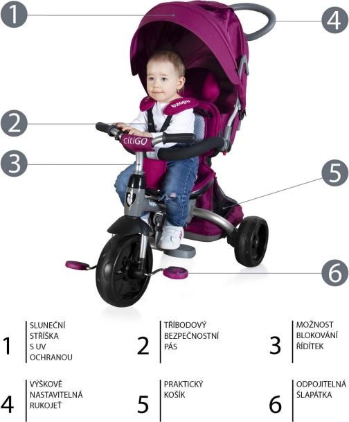 - Demontaža sunčane tende, prednje prečke, prednjeg naslona i pedala omogućuje djetetu bolji doživljaj vožnje.