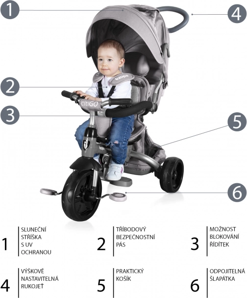- Ugrađene pedale omogućuju djetetu sudjelovanje u zajedničkoj vožnji.
