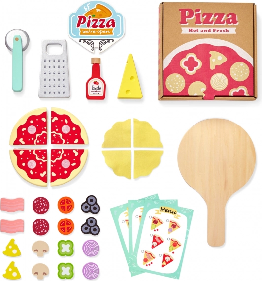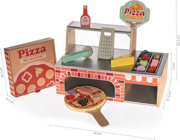 Drveni set Pizzeria idealna je igračka za male kuhare i ljubitelje pizze. Sadrži 34 dijela za vlastitu pizzeriju u vašoj sobi.