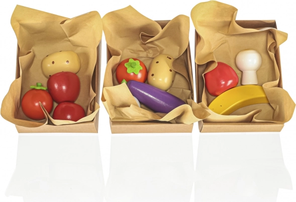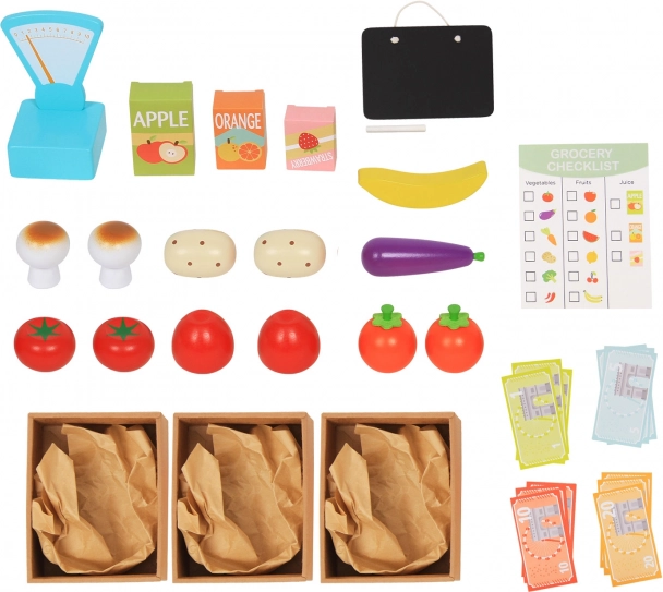 Paket uključuje sve što je potrebno za prodaju na tržnici – drveno voće i povrće, vagu i popis za kupnju.