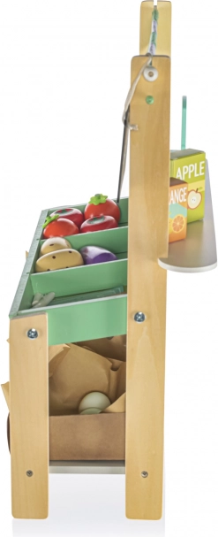 Kompletna trgovačka oprema – svi potrebni dodaci su dio pakiranja. Pronaći ćete drvene sanduke, vagu, popis za kupnju i novac. Djeca mogu preuzeti uloge trgovaca i kupaca te učiti kako funkcionira tržničko okruženje.