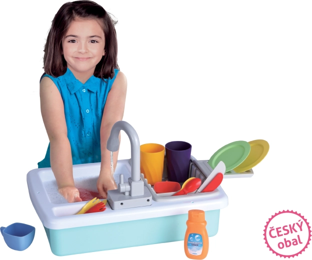 Ovaj plastični kuhinjski sudoper donosi djeci realističan doživljaj kuhanja i pospremanja. Zahvaljujući funkciji tekuće vode mali kuhari isprobat će kako se pere posuđe te istodobno vježbati koordinaciju ruku i odgovornost u kućanskim poslovima. Set je osmišljen za sigurno i dugotrajno igranje.