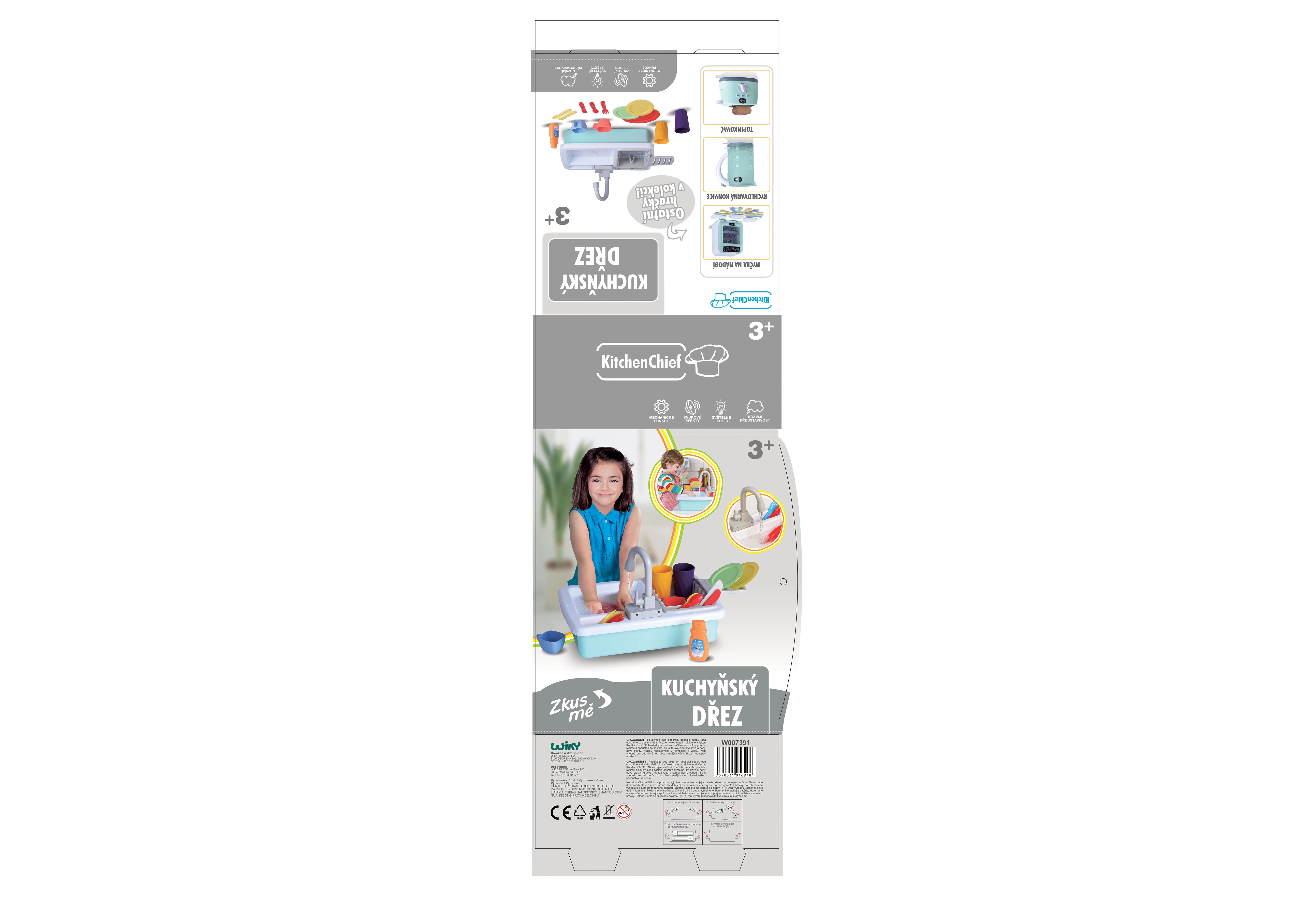 Dio pakiranja je praktična kuhinjska oprema s kojom djeca mogu odmah započeti: šalice, tanjurići, šalice za čaj, pribor za jelo te i detergent za posuđe za još realističniju igru. Sudoper je izvrstan dodatak svakoj dječjoj kuhinjici i zabavit će na duge sate.