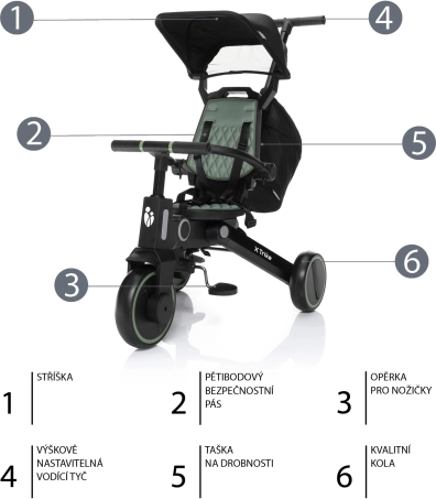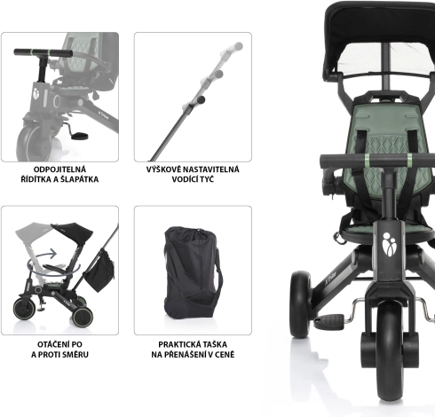 Multifunkcionalna tricikla X Trike nudi čak 7 načina korištenja – od dječjih kolica do samostalne vožnje. Zahvaljujući podesivoj upravljačkoj dršci, odvojivim pedalama i kompaktnom sklapanju idealna je za putovanja. Za sigurnost brinu 5-točkovni pojasevi, podesiva prečka, krov protiv sunca i nožna kočnica.