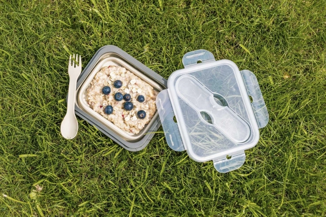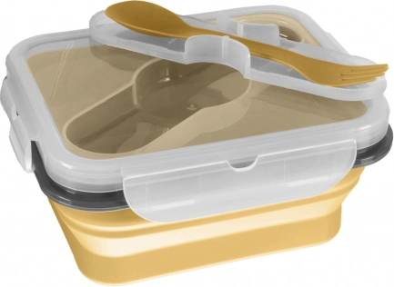 Ova kutija za užinu izrađena je od sigurnog silikona za kontakt s hranom, koji je netoksičan i otporan na lomljenje. Velika prednost je jednostavno sklapanje, zahvaljujući kojem smanjuje svoj volumen do 60 %, pa je idealan suputnik na izletima. Poklopac vrlo dobro brtvi, a u sebi ima ugrađeni pretinac za pribor; žličica s vilicom dolaze u praktičnoj futroli.