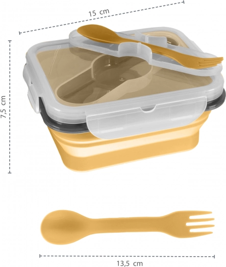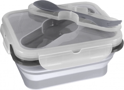 Ova kutija za užinu izrađena je od sigurnog silikona za prehranu, koji je netoksičan i otporan na lom. Velika prednost je jednostavno sklapanje, zahvaljujući kojem smanjuje svoju veličinu i do 60 %, pa je idealan suputnik na izletima. Poklopac vrlo dobro brtvi, a u sebi ima ugrađeni pretinac za pribor; žličica s vilicom dio su praktičnog etuija.