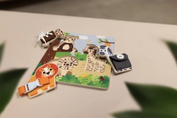 Zebra, lav i majmun vode djecu kroz svijet oblika i boja. Slagalice razvijaju koncentraciju, koordinaciju ruka–oko i prostorno opažanje.