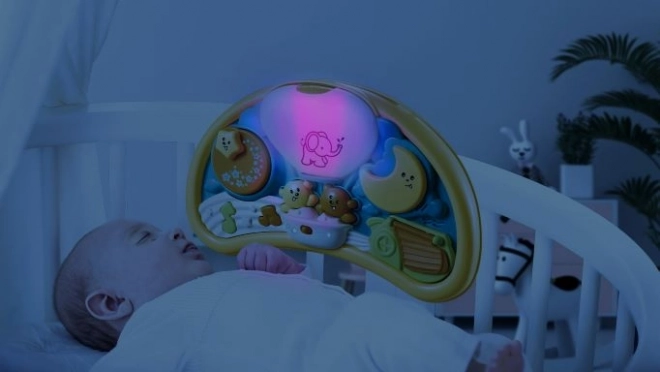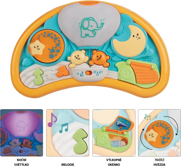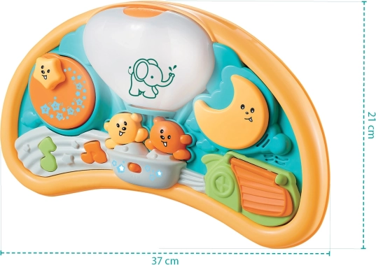 Preslatka interaktivna igračka koja će dijete zabavljati satima. Ploča u obliku mjeseca od kvalitetne plastike ima tipke s medvjedićima, zvjezdicama i mjesecom. Pritiskom na tipke sviraju melodije, elementi na ploči mogu se okretati i na razne načine otvarati. Igračka potiče maštu i psihomotoričke vještine. Noću igračka služi kao prigušeno noćno svjetlo koje pomaže djetetu savladati strah od mraka.