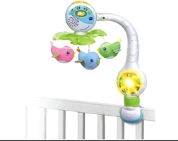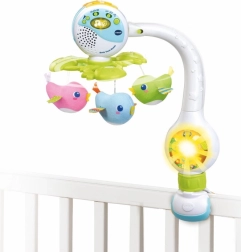 VTech pjevajući vrtuljak 3u1 svestran je pomagač za mirno uspavljivanje i zabavu na putu. Raznobojni ptići se nježno okreću te zajedno s glazbom i svjetlom stvaraju umirujuću atmosferu. Vrtuljak nudi hrvatske i slovačke melodije i uspavanke koje pomažu bebi brže zaspati i osjećati se sigurno.