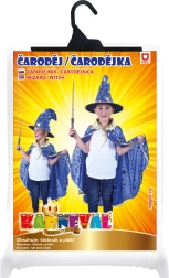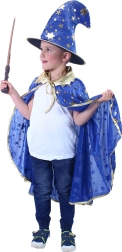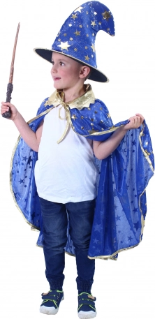 Ovaj ekskluzivni čarobnjački set jamči da nećete proći nezapaženo ni na jednom događaju! Plavi plašt ukrašen je zlatnim rubom i zvijezdama koje pojačavaju efekt. Šešir savršeno pristaje uz plašt i upotpunjuje cjelokupan dojam. Idealan za proslave Noći vještica ili bilo koji tematski karneval.