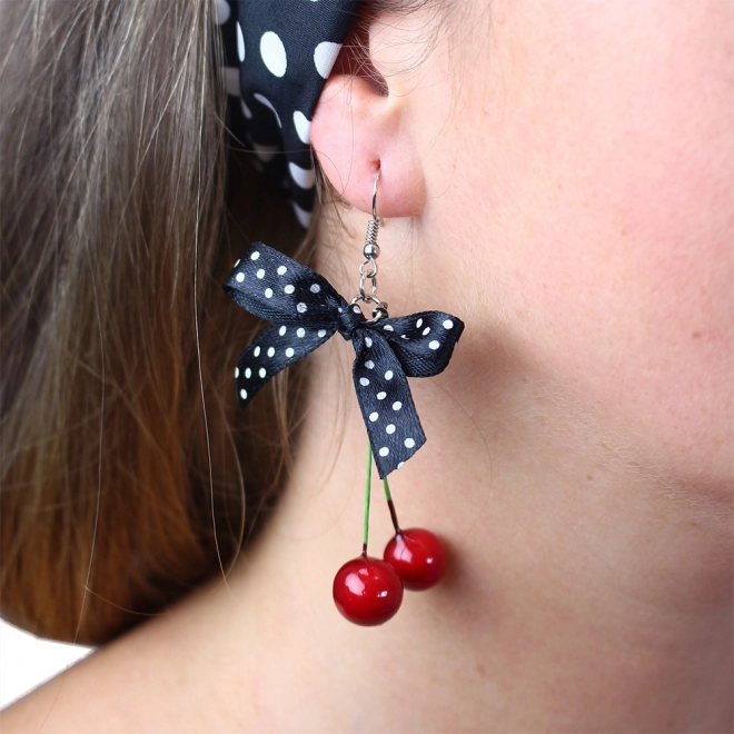Naušnice u obliku trešanja s crnom maramom s točkicama donose vašem stilu originalan i zaigran element.