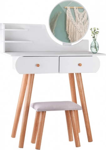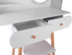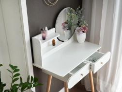 Skandinavski stil, kojeg su dizajneri zavoljeli još prije godina, savršeno se uklapa u svaku minimalističku sobu. Suvremena kućanstva sve se češće okreću ovom stilu namještaja i cijene njegov minimalistički karakter i neutralne boje. Zato se ova toaletna konzola savršeno uklapa u taj ugođaj. Njezin jednostavan dizajn i svijetle boje omogućit će joj da se uklopi u svaku prostoriju. Namještaj je izrađen isključivo od drvene MDF ploče. Namještaj se sastavlja samostalno i dolazi s detaljnim slikovnim priručnikom.