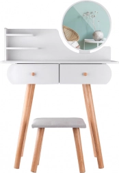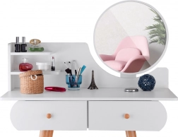 Toaletni stolić opremljen s dvije prostrane ladice, okruglim zrcalom, velikom pločom i mekom stoličicom presvučenom svijetlo bež materijalom svidjet će se gotovo svakoj djevojci. Namještaj je dovoljno velik da maloj toaletnoj konzoli služi dugi niz godina. Prostrane ladice lako će primiti nakit, kozmetiku, kopče, gumice za kosu itd. Većina malih djevojčica voli oponašati svoje mame, bake, sestre, a s ovakvim profesionalnim toaletnim stolićem mala elegantna djevojka moći će se osjećati posebno.