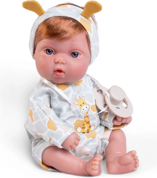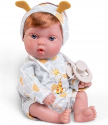 Lutka je odjevena u slatki žirafin kompletić, upotpunjen trakom za kosu s malim žutim ušima i dudurom, što pridonosi njezinu realističnom izgledu.