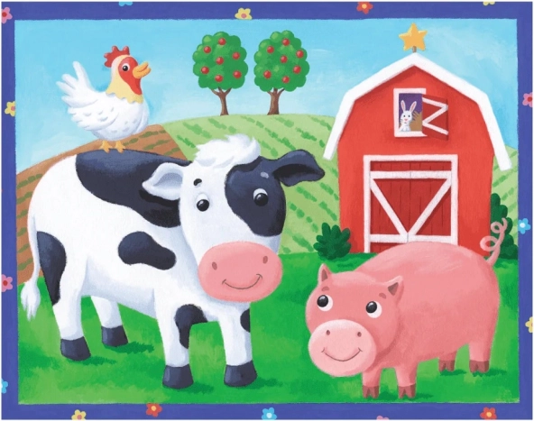 Otkrijte svijet životinja na farmi – kravica, prasić i pijetao razveselit će male graditelje, dok iz crvene staje proviruje zeko. Pozadina s brežuljkom i jablanima potiče maštu i pričanje priča. Slagalica je dizajnirana za male dječje ruke, dijelovi su ekstra debeli i lako se slažu.