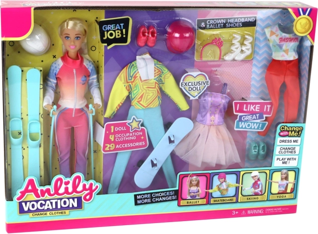 Sportska lutka Anlily sjajan je partner za igru koji djeci pruža puno kreativne zabave. Ova preslatka lutka ima plave oči, dugu plavu kosu za češljanje i mjeri 30 cm x 4 cm x 6 cm. U pakiranju se nalazi niz odjevnih kombinacija i dodataka koji omogućuju djeci igranje različitih uloga i upoznavanje raznih sportova.