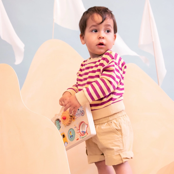 Predstavljamo interaktivni drveni panel u obliku kovčega, koji sadrži omiljene likove Lilliputiens. Ovaj panel je dizajniran kako bi vaše dijete moglo okretati, pritiskati, povlačiti, tresti i promatrati različite aktivnosti koje podržavaju razvoj kognitivnih sposobnosti.