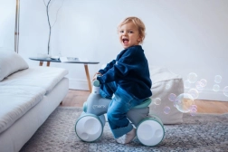 Ugrađeni uređaj za mjehuriće stvara niz mjehurića pritiskom na jedan gumb. Djeca vole vizualni efekt, a guralica se odmah pretvara u središte zabave.