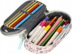 Unutarnju organizaciju čine pomični preklop s gumenim petljama za pribor za pisanje, džep na patentni zatvarač za sitnice i još dvije pretince za savršen red. Dvostruki patentni zatvarač s ergonomskim klizačima olakšava otvaranje i dječjim rukama. Stil upotpunjuju pahuljasti životinjski motiv i tiskana podstava.
