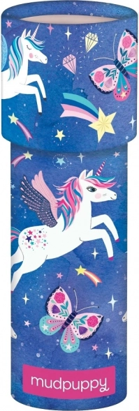 Pogledajte kroz okular i doživite čaroliju kaleidoskopa. Okrenite promatračku cijev i ugledat ćete šarene uzorke nalik draguljima – mašti nema granica. Kaleidoskop je ukrašen motivima jednoroga, leptira i padajućih zvijezda. Glavne značajke: potiče maštu; svi Mudpuppy proizvodi ispunjavaju sigurnosne norme CPSIA, ASTM, CE