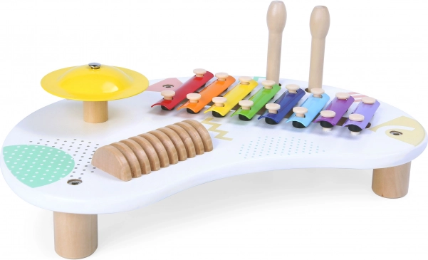 Dječji glazbeni stolić ECOTOYS idealan je izbor za male glazbenike. Nudi raznoliki 8-tonski ksilofon, jasno zvučeći činel i drvenu grebalicu za ritmičku pratnju. Zahvaljujući dvjema drvenim palicama djeca lako istražuju različite zvučne boje i uvježbavaju koordinaciju oko–ruka.