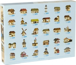 - Paket sadrži: drvene letvice određenih duljina, dijelove za krovove i zabate, kartonske izreske prozora i vrata, predtisnute papirnate otiske, shematski plan montaže.